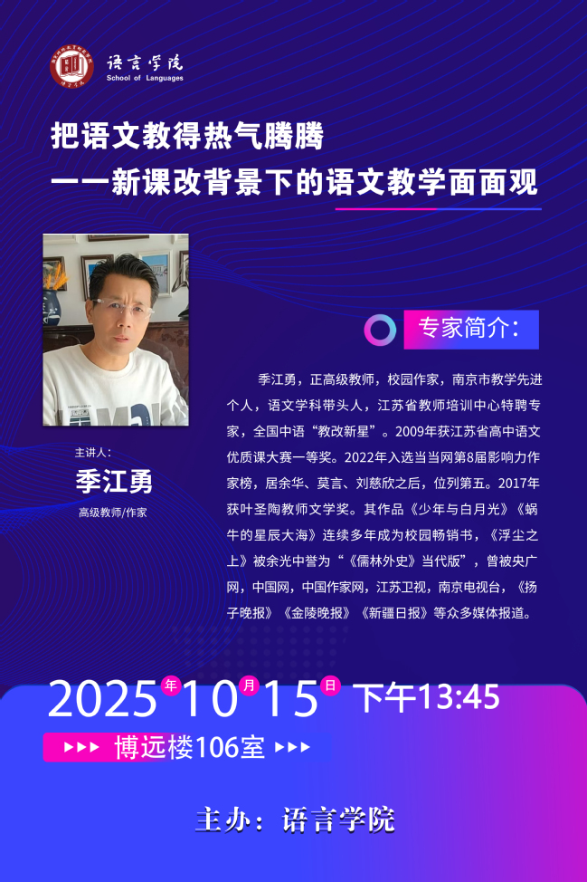 【学术预告】10月15日 季江勇 《把语文教得热气腾腾——新课改背景下的语文教学面面观》