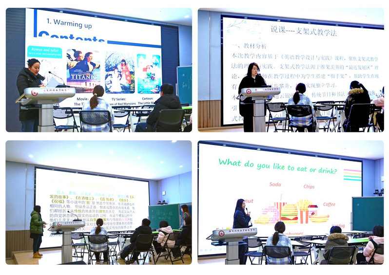 常钰婧老师以“支架式教学法”为主题进行说课与授课。她以南京云锦非遗寻访活动为生动导入,通过模拟织造过程阐释“搭建支架”的理念,并以小学英语《Chinese Festivals》为例,演示了如何通过问题链设计为学生搭建认知阶梯。点评环节,评委老师充分肯定其课程设计的巧思,认为云锦导入极具创意,将复杂技艺分解为可操作的“支架”步骤。同时建议在教学中进一步明确“支架拆除”的过程,帮助学生走向独立学习。