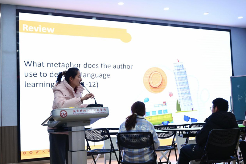 努尔亚老师讲授以西方“情人节”为主题,通过中英爱情谚语对比、文章精读等环节,引导学生批判性看待西方节日,在语言教学中自然融入文化对比。现场点评指出,教师口语表达流畅、以学生为中心,热身环节的文化对比设计巧妙。同时建议压缩热身时长、增加小组讨论,让学生在思维碰撞中深化理解。