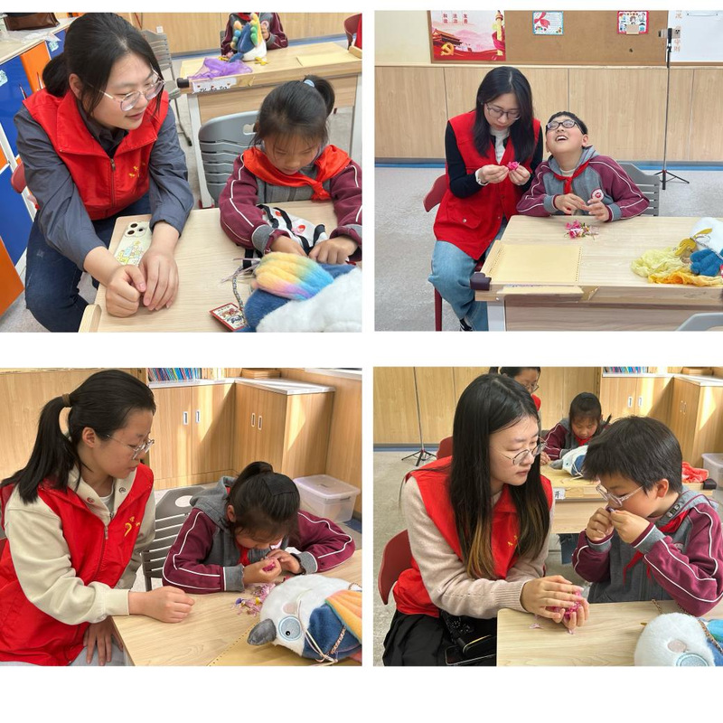 课程以“找春天”为线索,串联起孩子们学过的经典春日诗篇。第一站是《咏柳》。“不知细叶谁裁出,二月春风似剪刀。”在国老师的引导下,志愿者们轻轻挥动纱巾,模拟春风的温柔抚摸,孩子们在柳枝上找到了春天,真切感受到了春风吹绿柳枝的意境。第二站来到《春晓》。通过猜谜的方式,国老师引导孩子们想象春天的早晨听到鸟鸣、春夜风雨吹落花朵的情景。志愿者们特意准备了礼物——小鸟毛绒包,让他们用小手轻轻抚摸那毛茸茸、软绵绵的质感;“鸟瞰金陵”大创项目主持人林子涵同学播放了多种鸟儿的鸣叫声,并讲解了相关故事,孩子们化身“小鸟小歌手”,跟着鸟鸣一起欢快地“唱”起来。志愿者们还带来了新鲜的花瓣和花朵,让孩子们通过触摸花瓣的柔软、嗅闻花朵的芬芳,感知春天也藏在落花之中,加深对“花落知多少”的理解。