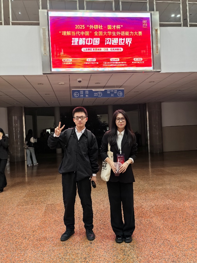 11月1日至11月2日,英语演讲赛项在南京航空航天大学举行。英语专业23级胡松涛、谢真沉着发挥,流利表达,均获得三等奖。