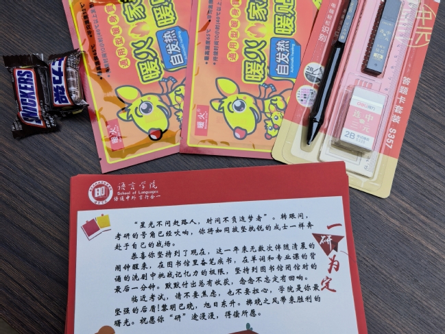 随着全国硕士研究生招生考试进入最后冲刺阶段,为助力考研学子坚定备考信心、缓解备考压力,语言学院在12月开展2026届“研途相伴·温暖同行”考研帮扶慰问活动。语言学院辅导员共同参与,为备考学子送上暖心关怀。