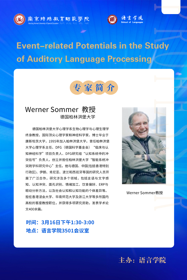 【学术预告】3月16日 Werner Sommer Event-Related Potentials in the Study of Auditory Language Processing