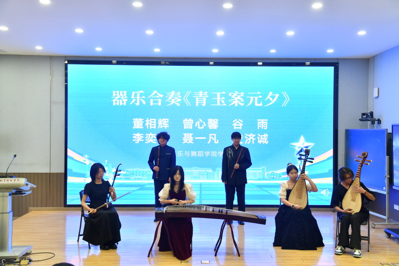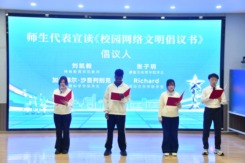 仪式现场,语言学院学子带来朗诵《月光下的中国》,音乐与舞蹈学院带来器乐合奏《青玉案·元夕》,特殊教育学院教师刘凯毅、康复与体育学院学生张子玥、教育科学学院学生加依娜尔·沙吾列别克、国际交流学院学生Richard作为师生代表共同宣读《校园网络文明倡议书》,号召全体师生争做校园好网民,守护清朗和谐的校园网络空间。