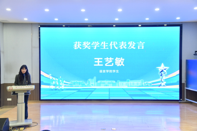 获奖学生代表、语言学院王艺敏和获奖教师代表、人工智能学院丁力老师先后发言,分享创作心路与育人故事。